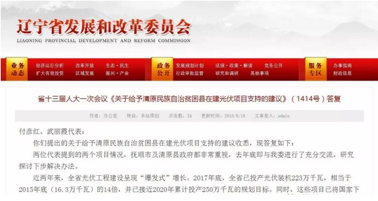 省十三屆人大一次會議《關于給予清原民族自治貧困縣在建光伏項目支持的建議》(1414號)答復