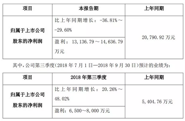 10月13日,蘇州中來光伏新材股份有限公司(以下簡稱“中來股份”)發(fā)布2018年前三季度業(yè)績預(yù)告。公告顯示,2018年1~9月公司預(yù)計(jì)歸屬于上市公司股東的凈利潤為1.31~1.46億元,較2017年同期的2.08億元同比下降29.60%~36.81%。其中,預(yù)計(jì)第三季度凈利潤6500~8000萬元,較2017年同期的5404.76萬元同比增長20.26%~ 48.02%。