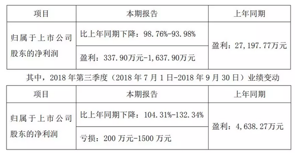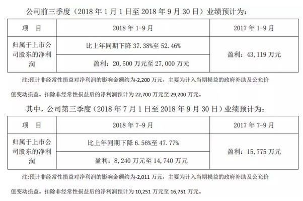 10月12日,東方日升新能源股份有限公司(以下簡稱“東方日升”)發(fā)布2018年前三季度業(yè)績預(yù)告。公告顯示,2018年1~9月公司預(yù)計(jì)歸屬于上市公司股東的凈利潤為2.05~2.7億元,比2017年同期的4.31億元同比下降37.38%~52.46%;其中,第三季度凈利潤預(yù)計(jì)為0.82~1.47億元,比2017年同期的1.58億元同比下降6.56~47.77%。