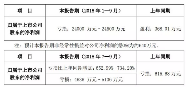 10月12日,浙江向日葵光能科技股份有限公司(以下簡稱“向日葵”)發(fā)布2018年前三季度業(yè)績預(yù)告。公告顯示,2018年1~9月公司預(yù)計(jì)歸屬于上市公司股東的凈利潤為虧損2.4~2.45億元,較2017年同期的盈利368萬元同比下降6622%~6758%!!!其中,第三季度凈利潤預(yù)計(jì)為虧損4636~5135萬元,較2017年同期的虧損615萬元,虧損同比增加652.99% ~734.20%。