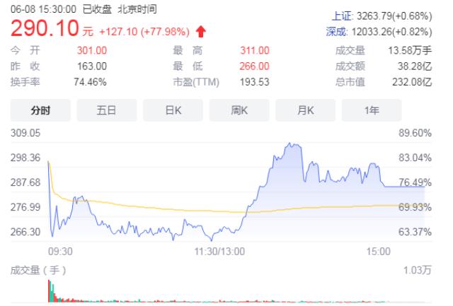 昱能科技今日開盤價(jià)為301元/股,開盤后一度下跌至266元/股,午后再度拉升,最終收盤價(jià)為290.10元/股,漲幅為77.98%,總市值為232.08億元。