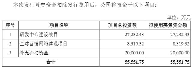 本次上市,昱能科技原計(jì)劃募資5.56億元,其中2.72億元用于研發(fā)中心建設(shè)項(xiàng)目,8319萬元用于全球營銷網(wǎng)絡(luò)建設(shè)項(xiàng)目,2億元用于補(bǔ)充流動(dòng)資金。