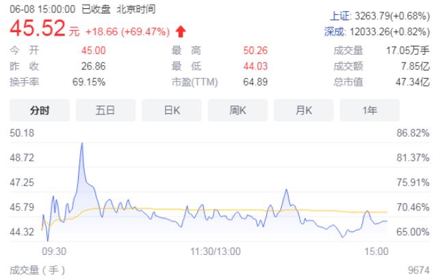 宇邦新材今日開盤價(jià)為45元/股,開盤后一度高達(dá)50.26元/股,此后震蕩下滑,最終收盤價(jià)為45.52元/股,漲幅為69.47%,總市值為47.34億元。