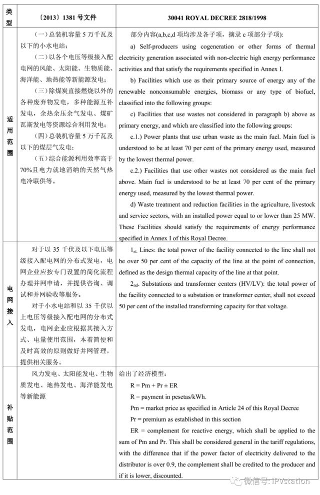 2013年7月,國家發展改革委印發《分布式發電管理暫行辦法》(發改能源〔2013〕1381號)中對分布式發電方式進行了定義,同時對項目建設和管理,電網接入、運行管理、補貼享受等進行了要求。本文通過整理,對比了該文件與1998年荷蘭的文件30041 ROYAL DECREE 2818/1998:表2政策對比表
