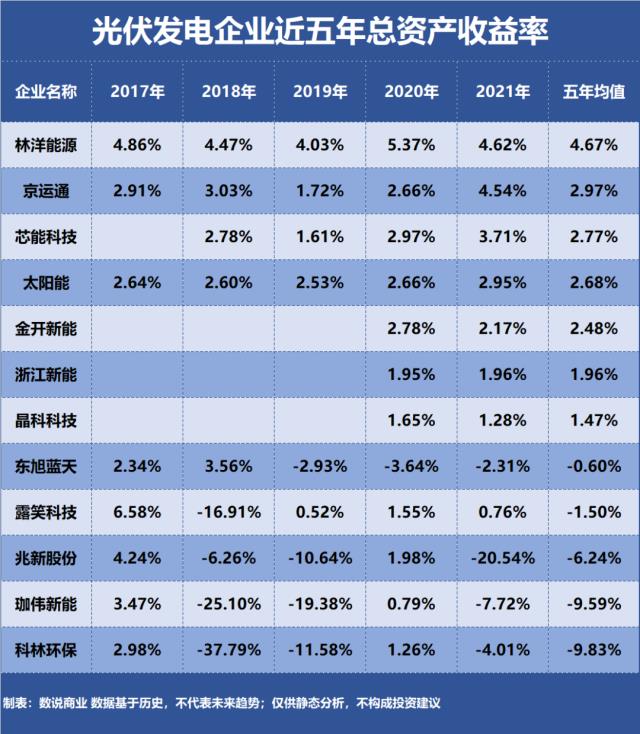 從近五年總資產收益率來看,林洋能源、京運通、芯能科技、太陽能、金開新能等5家企業超過2%,其中京運通平均總資產收益率2.97%。