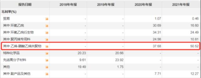 EVA膠膜目前是光伏膠膜市場的主力,膠膜是在組件中將光伏玻璃、電池片、背板粘在一起,同時有保護電池片、隔絕空氣的作用。雖然在組件中成本占比較低,僅3%-4%,但帶來的優勢在于下游組件廠商對價格敏感度不強,恰好給EVA廠商帶來較穩定的盈利空間,2021年在大部分化學產品毛利率下跌的時候,光伏EVA的毛利率逆市上揚(2021年聯泓新科的EVA毛利率達到50.52%)。