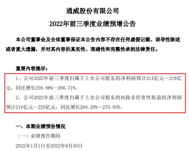10月9日,通威股份發(fā)布了2022年前三季度業(yè)績預(yù)增的公告。