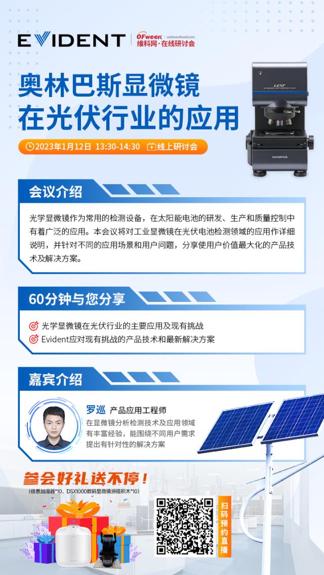 正基于此,由奧林巴斯主辦、OFweek太陽能光伏網承辦的《奧林巴斯顯微鏡在光伏行業的應用》專場在線視頻研討會即將于1月12日舉行。