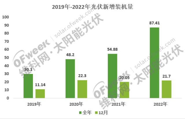 2022年前11月,我國光伏新增裝機已達65.71GW,同比增長88.7%。按此計算,2022年12月我國新增光伏裝機為21.7GW,全年新增裝機占比為近四年新低,不及預期。